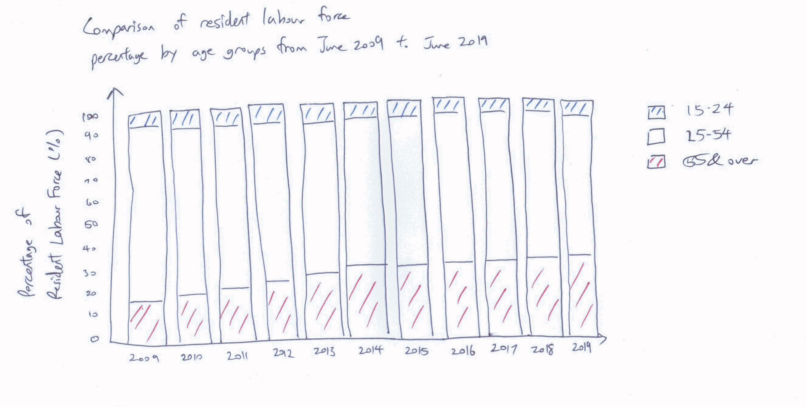 Comment: Chart title is unclear. It says ‘Resident labour force by age’ followed by ‘Per Cent’ at the bottom, which doesn’t really help in readers’ understanding.