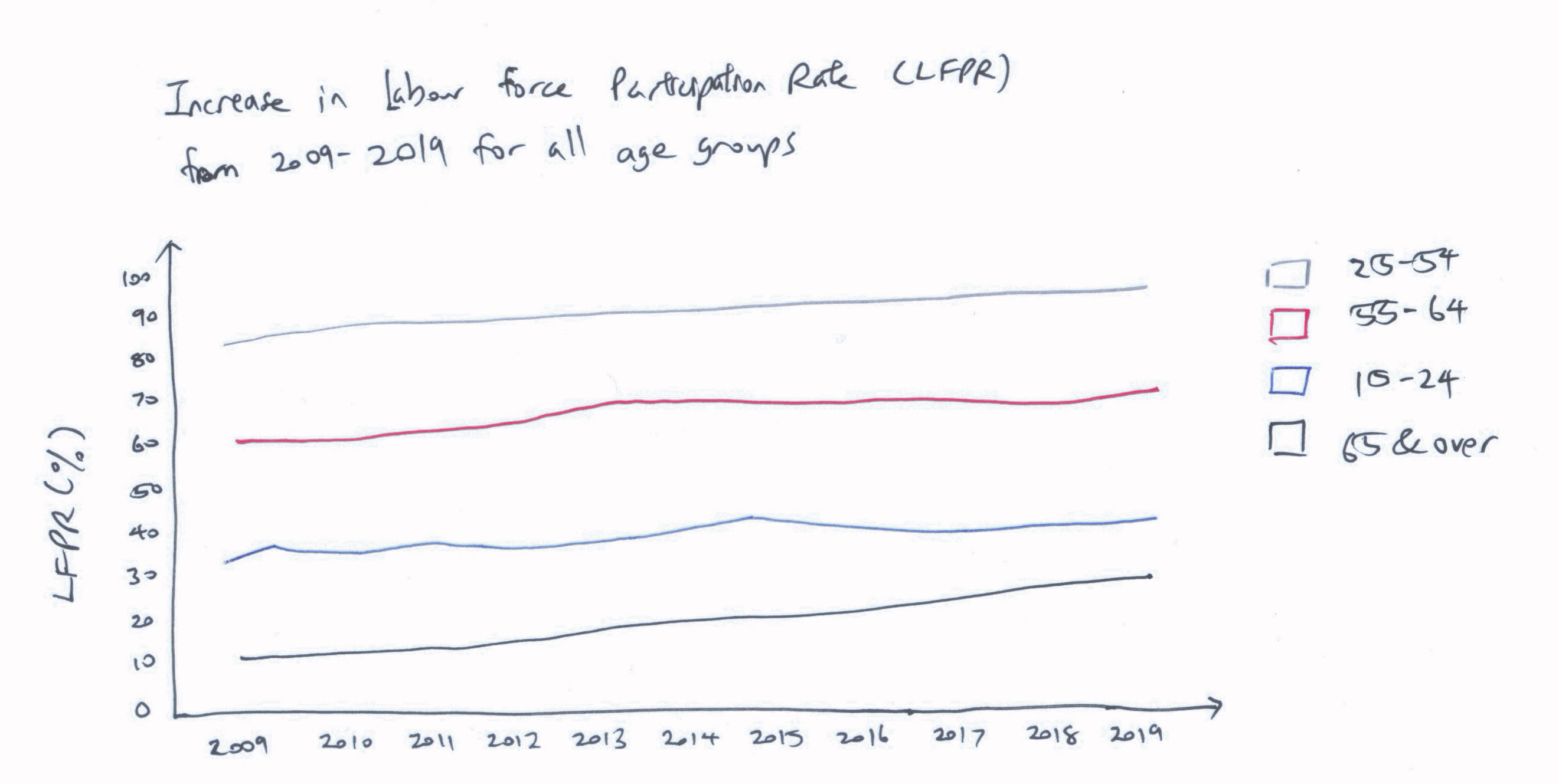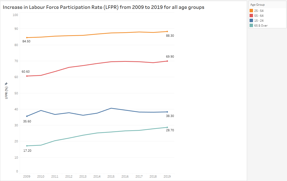 Suggestion: Have a separate visualisation to reference how LFPR has increased from 2009 to 2019 for the various age groups.