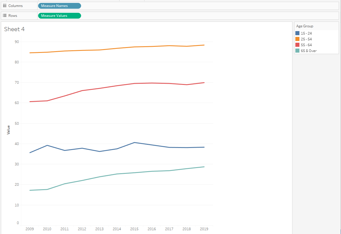 By binning the age groups and showing the group 25-54 specifically, viewers can now immediately visualize how the percentage of 25-54 dropped from 75% in 2009 to 67% in 2019 over the years. By switching from line chart to bar chart, categorical data of age groups is more correctly represented.