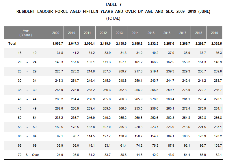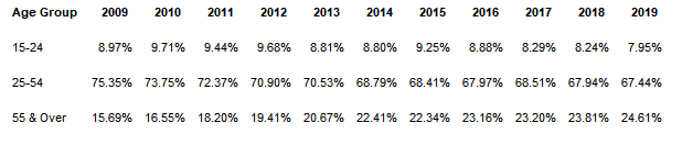 The share of the labour force aged 25-54 steadily declined over each year from 2009 to 2019, while that aged 55 & over steadily increased each year from 2009 to 2019, with only the exception from 2014 to 2015.